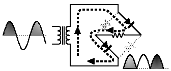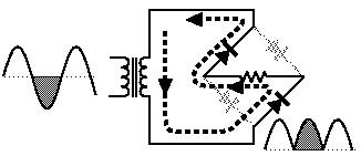 Bridge RectifierA bridge rectifier makes use of four diodes in a bridge arrangement to achieve full-wave rectification. This is a widely used configuration, both with individual diodes wired as shown and with single component bridges where the diode bridge is wired internally. ![]()