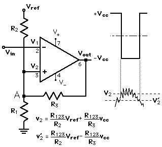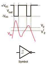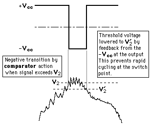 The Schmitt trigger action uses a comparator to produce stable level-crossing switches in contrast to the action of a straight Comparator Applications