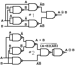 which can be implemented by the gate arrangements shown. They can also be implemented using NAND gates only. ![]()