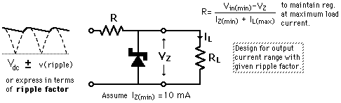 Calculation note: You may substitute values for the zener voltage, the input voltage, the ripple voltage or ripple factor, and the load resistor. The other parameters will be calculated. Default values will be entered for unspecified parameters used in the calculation.