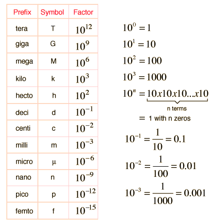 Powers of TenFor very large or very small numbers, it convenient to use the "scientific notation", i.e., to express the numbers in terms of a power of 10. Standard prefixes are used to denote certain powers of 10: ![]() |