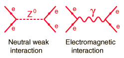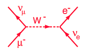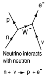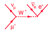 One of the four fundamental forces, the weak interaction involves the exchange of the intermediate vector bosons, the W and the Z. Since the mass of these particles is on the order of 80 GeV, the uncertainty principle dictates a range of about 10-18 meters which is about .1% of the diameter of a proton. The weak interaction changes one flavor of quark into another. For example, in the neutron decay depicted by the Feynman diagram at left above, one down quark is changed to an up quark, transforming the neutron into a proton. The primitive vertices in the Feynman diagrams for the weak interaction are of two types, charged and neutral. For leptons they take the following form ![]() The electron is used as an example in these diagrams, but any lepton can be substituted on the incoming side. The exit side (top) will be the same for the neutral vertex, but determined by the charge of the W in the charged vertex. Besides conserving charge, the vertex must conserve lepton number, so the process with the electron can produce an electron neutrino but not a muon neutrino.