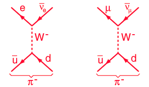 The charged vertices in the weak interaction with quarks take the form ![]() So it is seen that the quark changes its flavor when interacting via the W- or W+. As drawn, this interaction cannot be observed because it implies the isolation of an up quark. Because of quark confinement, isolated quarks are not observed. But rotating the Feynman diagram gives an alternative interaction, shown below for both electron and muon products. ![]() This suggests the weak interaction mechanism for the decay of the pion, which is observed to happen by the muon pathway. ![]() The weak interaction in the electron form at left above is responsible for the decay of the neutron and for beta decay in general.