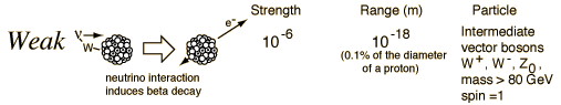 The Weak Force![]() One of the four fundamental forces, the weak interaction involves the exchange of the intermediate vector bosons, the W and the Z. Since the mass of these particles is on the order of 80 GeV, the uncertainty principle dictates a range of about 10-18 meters which is about 0.1% of the diameter of a proton. The weak interaction changes one flavor of quark into another. It is crucial to the structure of the universe in that 1. The sun would not burn without it since the weak interaction causes the transmutation p -> n so that deuterium can form and deuterium fusion can take place. 2. It is necessary for the buildup of heavy nuclei. The role of the weak force in the transmutation of quarks makes it the interaction involved in many decays of nuclear particles which require a change of a quark from one flavor to another. It was in radioactive decay such as beta decay that the existence of the weak interaction was first revealed. The weak interaction is the only process in which a quark can change to another quark, or a lepton to another lepton - the so-called "flavor changes". The discovery of the W and Z particles in 1983 was hailed as a confirmation of the theories which connect the weak force to the electromagnetic force in electroweak unification. The weak interaction acts between both quarks and leptons, whereas the strong force does not act between leptons. "Leptons have no color, so they do not participate in the strong interactions; neutrinos have no charge, so they experience no electromagnetic forces; but all of them join in the weak interactions."(Griffiths)