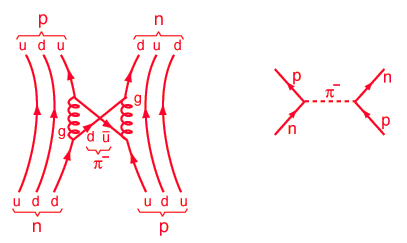 The Strong Force![]() A force which can hold a nucleus together against the enormous forces of repulsion of the protons is strong indeed. However, it is not an inverse square force like the electromagnetic force and it has a very short range. Yukawa modeled the strong force as an exchange force in which the exchange particles are pions and other heavier particles. The range of a particle exchange force is limited by the uncertainty principle. It is the strongest of the four fundamental forces Since the protons and neutrons which make up the nucleus are themselves considered to be made up of quarks, and the quarks are considered to be held together by the color force, the strong force between nucleons may be considered to be a residual color force. In the standard model, therefore, the basic exchange particle is the gluon which mediates the forces between quarks. Since the individual gluons and quarks are contained within the proton or neutron, the masses attributed to them cannot be used in the range relationship to predict the range of the force. When something is viewed as emerging from a proton or neutron, then it must be at least a quark-antiquark pair, so it is then plausible that the pion as the lightest meson should serve as a predictor of the maximum range of the strong force between nucleons. ![]() The sketch is an attempt to show one of many forms the gluon interaction between nucleons could take, this one involving up-antiup pair production and annililation and producing a π- bridging the nucleons.