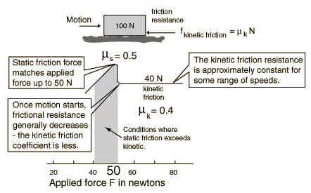 Friction PlotStatic friction resistance will match the applied force up until the threshold of motion. Then the kinetic frictional resistance stays about constant. This plot illustrates the standard model of friction. ![]() The above plot, though representing a simplistic view of friction, agrees fairly well with the results of simple experiments with wooden blocks on wooden inclines. The experimental procedure described below equates the vector component of the weight down the incline to the coefficient of friction times the normal force produced by the weight on the incline. ![]() Having taken a large number of students through this experiment, I can report that the coefficient of static friction obtained is almost always greater than the coefficient of kinetic friction. Typical results for the woods I have used are 0.4 for the static coefficient and 0.3 for the kinetic coefficient. When carefully standardized surfaces are used to measure the friction coefficients, the difference between static and kinetic coefficients tends to disappear, indicating that the difference may have to do with irregular surfaces, impurities, or other factors which can be frustratingly non-reproducible. To quote a view counter to the above model of friction: |