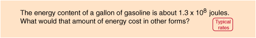 Sample of Energy RatesAn electricity rate from the Atlanta area in Spring 1992 was 7.2¢ per kilowatt-hour. In the summer of 2001, the rate was 9.5¢/kwh. This compares with a lower winter rate for 2001 of 6.8¢/kwh. Natural gas billings are typically based on units of 1000 cubic feet and the energy content of a cubic foot varies somewhat but is just over a thousand BTU per cubic foot. Atlanta natural gas companies often quote energy in MBTU = 1000 BTU, the M being the Roman numeral for 1000. Based on a billing in which the energy content was 1.021 MBTU/cubic foot, a spring 1992 residential bill was $5.90 per 1000 cubic feet. After rising gradually for several years, natural gas prices rose dramatically in 2001, with a cost of $10.56 per 1000 cubic feet in January and $13.78 per 1000 cubic feet in the summer. A ton of coal and a cord of wood have similar energy content, and although prices vary widely, around $100 for a ton of coal or a cord of wood was not untypical in 1990. Houston Lighting and Power, with 1.38 million customers, quotes 8.3¢ per kwh average for 1990 in their annual report. Average annual use per residential customer was 13,849 kwh. They quote their fuel cost per MBtu as $1.79 for natural gas, $2.21 for coal, $1.60 for lignite, and $.58 for nuclear.