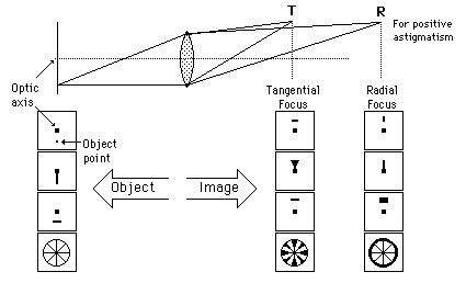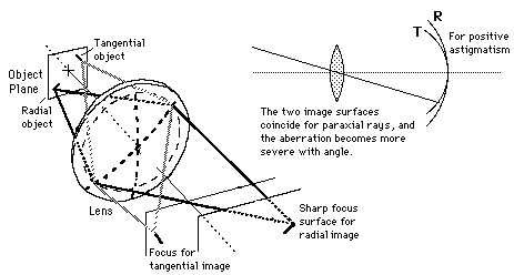 Oblique AstigmatismOblique astigmatism is an aberration of off-axis rays that causes radial and tangential lines in the object plane to focus sharply at different distances in the image space. ![]()
