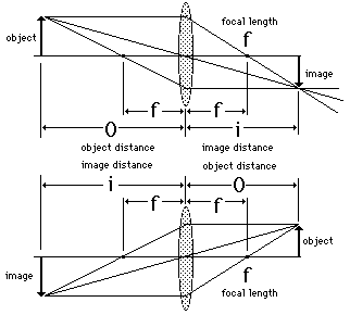 The two photographs above show conjugate images formed by a lens of focal length 15 cm. In the top photo, the object distance is 23 and the image distance 43 cm, showing a magnification of -1.9. In the bottom photo, the distances are reversed giving a magnification of -0.54 associated with the shorter image distance.