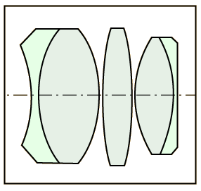 This eyepiece is characterized by its wide field of view and high magnification. It finds application in high-power telescopes and range finders. It corrects well for distortion. The triplet corrects well for chromatic aberration. |