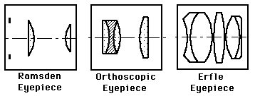 EyepiecesThe eyepiece for many optical instruments is a simple magnifier. Because of aberrations, a single lens is not adequate for the eyepiece of a high quality optical instrument, and many lens combinations have been developed to minimize the aberrations. A sample is shown here. ![]() |