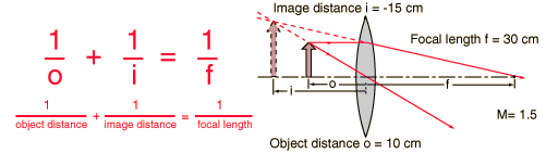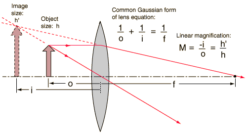 If an object distance smaller than the focal length is entered to agree with the illustration, then the image is an enlarged virtual image on the same side of the lens as the object and will give a negative image distance. If a calculation yields a negative focal length, then the lens is a diverging lens rather than the converging lens in the illustration. The lens equation can be used to calculate the image distance for either real or virtual images and for either positive on negative lenses. The linear magnification relationship allows you to predict the size of the image.