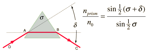 PrismsA refracting prism is a convenient geometry to illustrate dispersion and the use of the angle of minimum deviation provides a good way to measure the index of refraction of a material. Reflecting prisms are used for erecting or otherwise changing the orientation of an image and make use of total internal reflection instead of refraction. ![]() White light may be separated into its spectral colors by dispersion in a prism. ![]() Prisms are typically characterized by their angle of minimum deviation d. This minimum deviation is achieved by adjusting the incident angle until the ray passes through theprism parallel to the bottom of the prism. An interesting application of refraction of light in a prism occurs in atmospheric optics when tiny hexagonal ice crystals are in the air. This refraction produces the 22° halo commonly observed in northern latitudes. The fact that these ice crystals will preferentially orient themselves horizontally when falling produces a brighter part of the 22° halo horizontally to both sides of the sun; these bright spots are commonly called "sundogs".