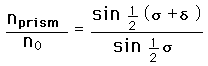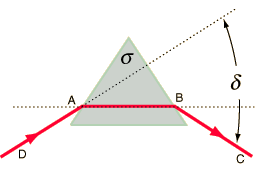PrismsThe angle of minimum deviation for a prism may be calculated from the prism equation. Note from the illustration that this minimum deviation occurs when the path of the light inside the prism is parallel to the base of the prism. If the incident light beam is rotated in either direction, the deviation of the light from its incident path caused by refraction in the prism will be greater. White light may be separated into its spectral colors by dispersion in a prism. |