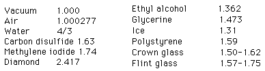 The indices of refraction of some common substances are given below with a more complete description of the indices for optical glasses given elsewhere. The values given are approximate and do not account for the small variation of index with light wavelength which is called dispersion.