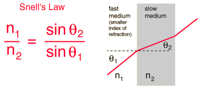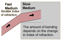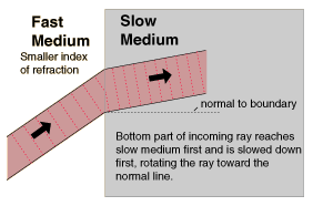 Refraction is the bending of a wave when it enters a medium where it's speed is different. The refraction of light when it passes from a fast medium to a slow medium bends the light ray toward the normal to the boundary between the two media. The amount of bending depends on the indices of refraction of the two media and is described quantitatively by Snell's Law.