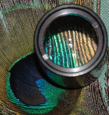 A water droplet can act as a simple magnifier and magnify the object behind it. Water tends to form spherical droplets under the influence of surface tension. When attached to an object like these examples, the spherical shape is distorted, but still capable of forming an image. Above the droplets are on tiny emerging pine cones. At left the droplet forms a partial image of the flower that is out of focus behind it.