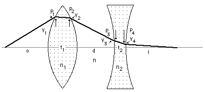 Vergence ExampleThe example below shows a positive lens followed by a negative one, but the powers can be given any value, positive or negative. At each surface the relationship V + Ps = V' is applied, and the change in vergence between surfaces is calculated. ![]() |
