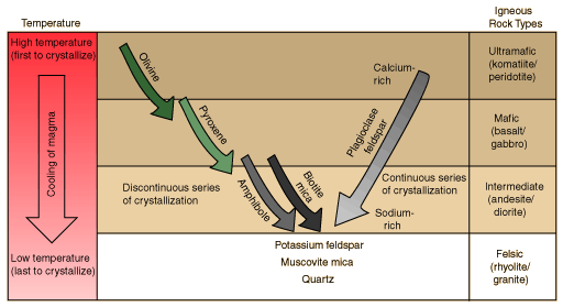 Bowen's Reaction SeriesIn the early part of the 20th century, N. L. Bowen carried out experiments to characterize the process of crystallization of igneous rocks from magma. The illustration below is patterned after Lutgens and Tarbuck's perspective of that reaction series. ![]() The difference in crystallization temperature for the different kinds of minerals plays a major role in the differentiation of rock composition as the magma cools. |