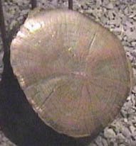 One of the more unusual forms is exhibited in this cross-section of a post which served as a support in a copper mine. It has been partially infilled and replaced by copper from the ground water in which it was submerged. The post is about 12 cm in diameter.