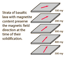 | Iron-rich magnetic minerals such as magnetite are present in basaltic lava flows. A characteristic of ferromagnetism is that it disappears when you heat the material above a temperature known as the Curie temperature, which is 1043K for pure iron, but is reported to be about 850 K (580°C) for magnetite. When these minerals drop below their Curie temperatures in the process of solidifying, they are slightly magnetized in the direction of the Earth's magnetic field at this time. This forms a durable record of the direction of the magnetic field of the Earth at the time of solidification.