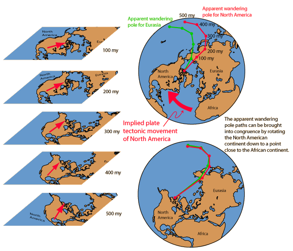 A problem arose with the comparison of the Eurasian and North American studies, since they showed different paths for the "pole wandering". But it was found that if you migrated the North American continent over toward the African continent, the curves came into congruence. The "problem" of different pole wandering paths became powerful evidence that the continents themselves had changed their relative positions in comparison to a presumably almost stationary magnetic pole.