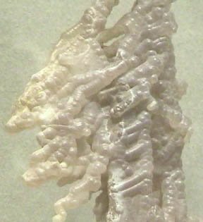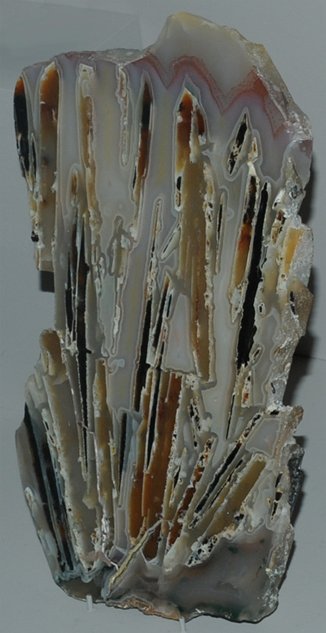 Quartz is silicon dioxide, SiO2. Quartz is abundant in the Earth's crust, being the chemically simplest form of the silicates. All the samples here are displayed in the Smithsonian Museum of Natural History. One of the names applied to quartz is chalcedony. It is not a specific name and has been used for a variety of types of quartz. It is used here following the usage at Smithsonian to describe those types of quartz which were formed in an apparent tubular formation, like multiple flows or stalactite forms. The sample at right is about 10x35 cm and is from Namibia.
