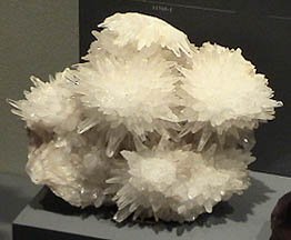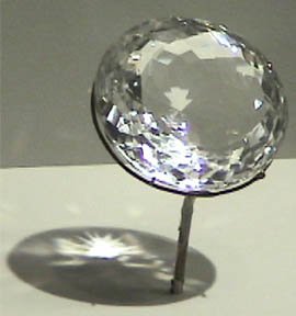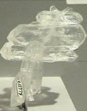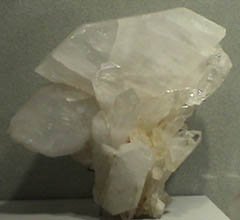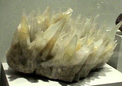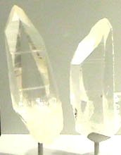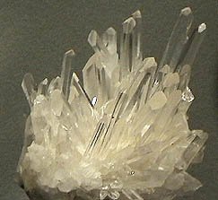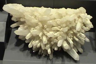 Quartz is silicon dioxide, SiO2. Quartz is abundant in the Earth's crust, being the chemically simplest form of the silicates. All the samples here are displayed in the Smithsonian Museum of Natural History. Perhaps the first visualization of quartz is as a clear crystal, and several examples are shown here. The clear quartz gem shown at right is 353.6 carats and is from Chestnut Hill Township, North Carolina. It appears to be about 3 cm across.