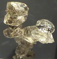 This sample of quartz is about 6x10 cm and is from Middleville, New York. It is described with the phrase "Herkimer Diamond", which refers to "beautifully doubly-terminated quartz crystals already faceted by nature". More comments from the website: "The bedrock in which the crystals are found began forming approximately half a billion years ago in a shallow Cambrian sea that lapped against the southern shores of the ancestral Adirondack Mountains. They make attractive cabinet specimens, either in groups of loose crystals, singly, or in a matrix, all just as they come from the ground. The most perfect crystals, are often used as display pieces in jewelry."