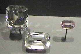 These crystal quartz gems are 654 and 358 carats. The rose quartz gem is 48.6 carats. They are from Minas Gerais, Brazil.