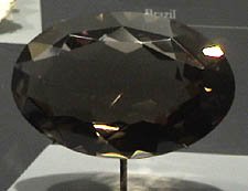 Quartz is silicon dioxide, SiO2. Quartz is abundant in the Earth's crust, being the chemically simplest form of the silicates. All the samples here are displayed in the Smithsonian Museum of Natural History. Smoky quartz is one of the noted varieties of quartz, and is often of gem quality. The gem shown at right is 144.9 carats and is from Scotland. |  |