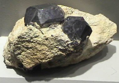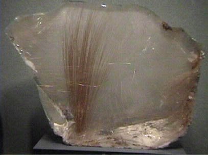 Rutile | This sample of rutile is on display at the Smithsonian Museum of Natural History. Rutile is titanium dioxide, TiO2, and it appears as fine red crystals within the larger clear quartz mineral. The size of the sample is about 15-20 cm high. |