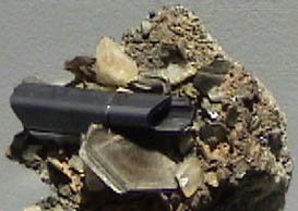 The inclusion of microscopic needle crystals of rutile in sapphires and sometimes rubies gives to those gems a remarkable six-sided "star" reflection effect. The needle crystals intersect at angles of 60° to provide the star effect which is prominent enough to lead to the description "star sapphire" for some specimens of sapphire. Rutile is one of the minerals which exhibit significant double refraction. | This sample of rutile is from Champion Mine, Mono County, California. It measures about 10x9 cm. |  |