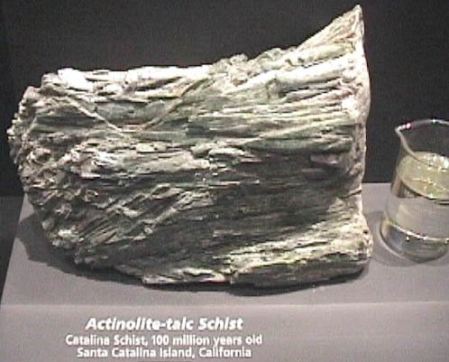Talc is a soft mineral, measuring about 1 on the Mohs hardness scale. The softest of the common minerals, it can be scratched with a fingernail. This sample is on display at the Smithsonian Museum of Natural History.