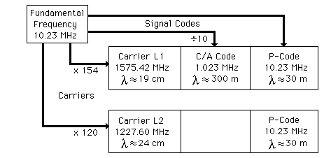 GPS Signal Structure![]() The two carriers and the two signal codes of the GPS system are derived directly from the onboard atomic clock oscillators. By decoding the navigation message from three GPS satellites, the position on the earth can be calculated. |