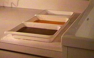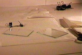 In the darkroom with the safelight on, carefully remove one piece of film from the film safe and carefully reclose the safe. The film may be cut to size and then placed on one of the glass plates on some paper towel for padding. Place the other plate on top and carefully squeeze the air out and clamp with the paper clips.