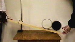 Hoop and Cylinder MotionGiven a race between a thin hoop and a uniform cylinder down an incline, rolling without slipping. Which will win? ![]() Mass and radius cancel out in the calculation, showing the final velocities to be independent of these two quantities.