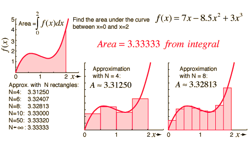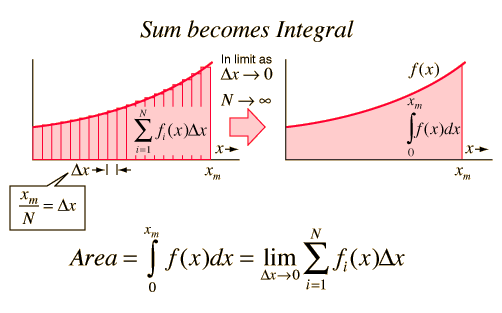 Integral as Limit of AreaThe approximation to the area under a curve can be made better by making the approximating rectangles narrower. The idea of the integral is to increase the number of rectangles N toward infinity by taking the limit as the rectangle width approaches zero. ![]() While the concept of geometrical area is a convenient way to visualize an integral, the idea of integration is much more general than that. Any continuous physical variable can be "chopped up" into infinitesmal increments (differential elements) so that the sum of the product of that "width" and some function approaches an infinite sum. The integral is a powerful tool for modeling physical problems which involve continuously varying quantities.