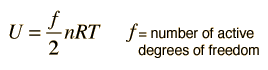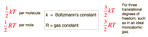 serves well in the definition of kinetic temperature since that involves just the translational degrees of freedom, but it fails to predict the specific heats of polyatomic gases because the increase in internal energy associated with heating such gases adds energy to rotational and perhaps vibrational degrees of freedom. Each vibrational mode will get kT/2 for kinetic energy and kT/2 for potential energy - equality of kinetic and potential energy is addressed in the virial theorem. Equipartition of energy also has implication for electromagnetic radiation when it is in equilibrium with matter, each mode of radiation having kT of energy in the Rayleigh-Jeans law.