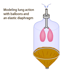RespirationThe process of respiration involves the lowering of the diaphragm to increase the volume of the thoracic cavity, which by the ideal gas law is seen to lower its pressure. A model of lung action can be made with a bell jar, balloons, and an elastic membrane. The thoracic cavity normally has a negative gauge pressure to keep the lungs inflated, and the diaphragm action must lower it more to accomplish inhalation. The inhalation process must accomplish the inflation of the alveoli of the lungs, which itself is a remarkable process. The pressure achieved by the diaphragm action is only about -4 mmHg compared to a pressure inside the alveoli of about -3 mmHg, so inhalation must be accomplished with a pressure differential of only about 1 mmHg. The remarkable efficiency of oxygen transport across the lung membranes is characterized in Fick's Law.