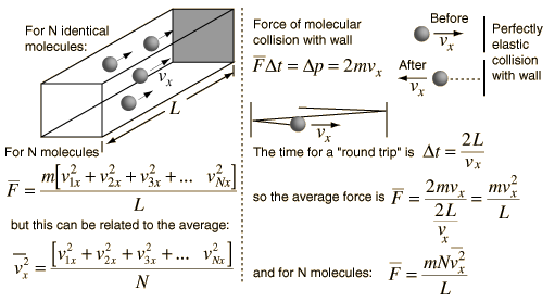 Newton's Laws and CollisionsApplying Newton's Laws to an ideal gas under the assumptions of kinetic theory allows the determination of the average force on container walls. This treatment assumes that the collisions with the walls are perfectly elastic. ![]() In this development, an overbar indicates an average quantity. In the expression for the average force from N molecules, it is important to note that it is the average of the square of the velocity which is used, and that this is distinctly different from the square of the average velocity.