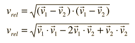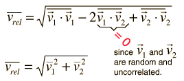 Average Relative VelocityIn order to calculate the mean free path for a molecule of a gas, it is necessary to assess the average relative velocity of the molecules involved rather than just the average velocity of any given molecule. The relative velocity of any two molecules can be expressed in terms of their vector velocities. ![]() The magnitude of the relative velocity can be expressed as the square root of the scalar product of the velocity with itself. ![]() This expression can be expanded as follows. ![]() Taking the average of the terms leads to ![]() Since the same average velocity would be associated with each molecule, this becomes ![]()