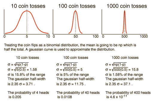 Comment on Statistical Methods in PhysicsWhile it may seem disturbing to describe physical phenomena in the same language you would use for coin flips or throwing dice, consider that in describing natural systems of atoms or molecules, we have on the order of Avogadro's number of events. If you are content to know things within a certain margin of error, say 1%, then the statistics of large numbers can give you that. Taking coin flips as an example and using the binomial distribution, you know the mean number of "heads" is going to be the number of flips (n) times the probability (p=0.5) so that np = half the total. ![]() In terms of percent deviation from the expected result, it is clear that the statistical result from a large number of events is much more precise.