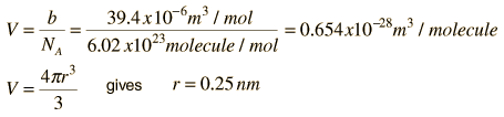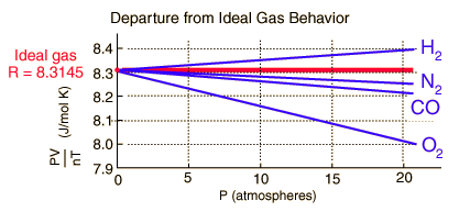 Since the constant b is an indication of molecular volume, it could be used to estimate the radius of an atom or molecule, modeled as a sphere. Fishbane et al. give the value of b for nitrogen gas as 39.4 x 10-6 m3/mol. This leads to the following estimate of radius: ![]() In the periodic table is found an atomic radius of 0.075 nm for nitrogen, so the above estimate for a nitrogen molecule is plausible. The plot below (after Fishbane, et al.) shows significant departure from the ideal gas law, about 3% in 20 atmospheres pressure for oxygen. The departure is measurable even at one atmosphere pressure, but not large. The fact that all gases extrapolate to the same value is the basis for the definition of the Kelvin temperature scale in terms of that limiting value. ![]() |