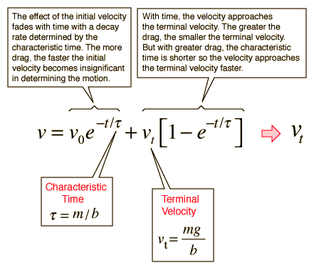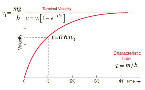 Velocity Graph, Linear Drag![]() This behavior of velocity as a function of time would be expected for an object released from rest in a viscous medium where the resistance was proportional to velocity. The g value would be adjusted if there was significant buoyancy, and usually is then written g'.