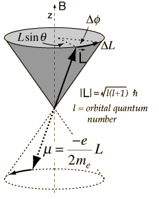 When a torque is exerted perpendicular to the angular momentum L, it produces a change in angular momentum DL which is perpendicular to L, causing it to precess about the z axis. Labeling the precession angle as f, we can describe the effect of the torque as follows: ![]() The precession angular velocity (Larmor frequency) is ![]() These relationships for a finite current loop extend to the magnetic dipoles of electron orbits and to the intrinsic magnetic moment associated with electron spin. There is also a characteristic Larmor frequency for nuclear spins. In the case of the electron spin precession, the angular frequency associated with the spin transition is usually written in the general form where g is called the gyromagetic ratio (sometimes the magnetogyric ratio). This angular frequency is associated with the "spin flip" or spin transition, involving an energy change of 2mB. An example for magnetic field 1 Tesla follows. ![]() The characteristic frequencies associated with electron spin are employed in electron spin resonance (ESR) experiments, and those associated with the nuclear spin in nuclear magnetic resonance (NMR) experiments. |