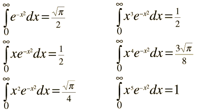 Definite Integrals Associated with Gaussian DistributionsIn physical systems which can be modeled by a Gaussian distribution, one sometimes needs to obtain the average or expectation value for physical quantities. If these properties depend on x, then they can be integrated to find the average value. For the first five powers of x, the integrals have the following forms: ![]()