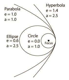 Each of the conic sections can be described in terms of a semimajor axis a and an eccentricity e. Representative values for these parameters are shown along with the types of orbits which are associated with them.