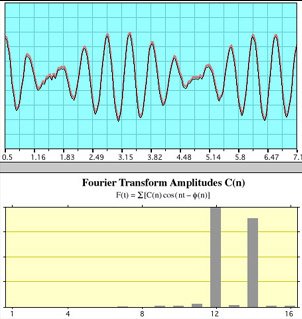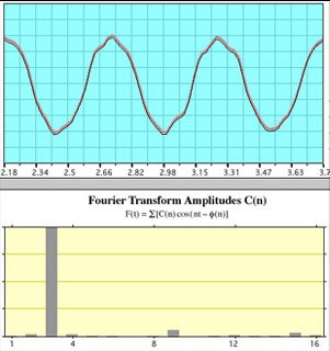 | Whistle BThis is the same kind of display with whistle B alone. Three periods were chosen for the FFT this time, resulting in a main peak at position 3. |