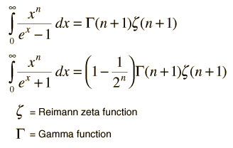 Functions for StatisticsA form of integral which shows up regularly in quantum statistics is ![]() The evaluation of this class of integrals is in terms of two special functions, the gamma function and the Riemann zeta function. ![]() |